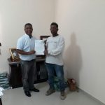 El honorable Alcalde Alfredo Carrasco del municipio de Villa Jaragua mientras hace entrega de los Recursos de Avances a los Maestros Constructores Julio Ángel Cuevas Méndez y Melvin Sierra Segura Para la construcción de Contenes